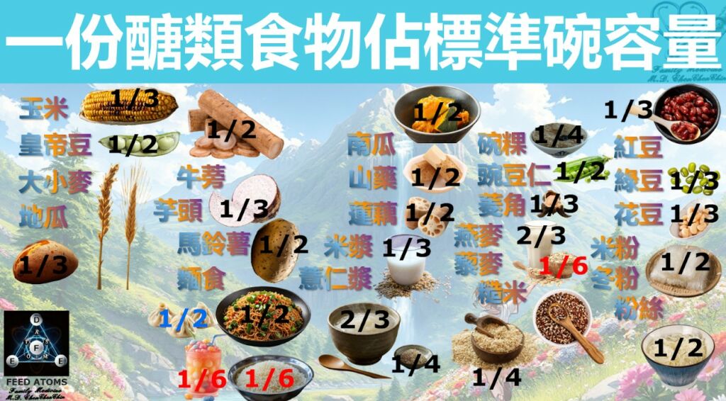 醣類食物的份量估算採用煮熟可食用狀態,並以標準碗體積與白飯進行等體積互換比較。