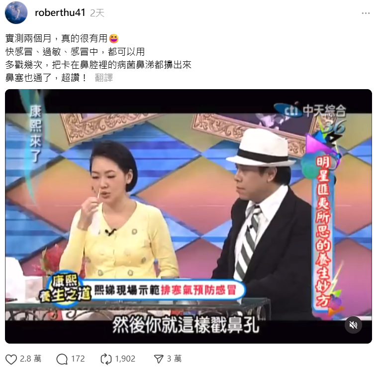 小S說,她親自試過這個方法,結果真的「一直噴嚏打不停,全身冒汗,後來感冒也跟著好了!」影片播出後,許多網友留言:「實測兩個月,真的很有用!」、「這有效啊!吹到冷風快要感冒前可以試看看。」但也有人反應:「我之前就是會這樣用,但每次都會變成鼻竇炎。」