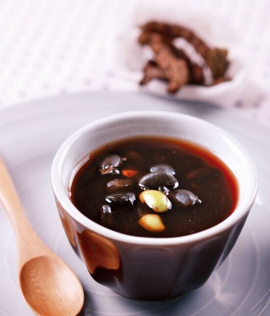 - 將兩者一起放進砂鍋內,加入清水1,250毫升(約5碗量),大火煲沸後改小火煲30分鐘,調入適量冰糖,即可。