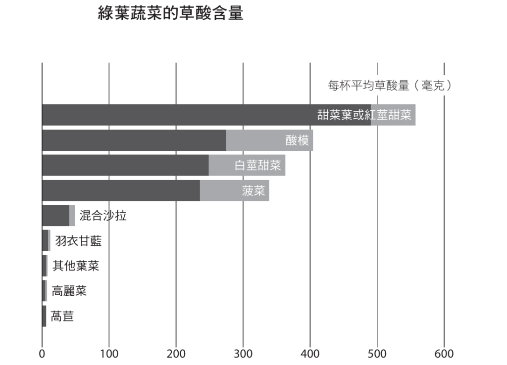 高草酸蔬菜,每杯平均草酸量(毫克)排名依序為:甜菜葉或紅莖甜菜、酸模、白莖甜菜、菠菜