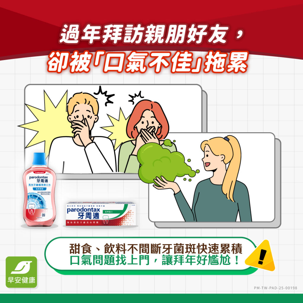 過年走春拜年、親友聚餐,與平時較少往來的親戚朋友近距離聊天互動增加,口氣狀況自然更容易被放大檢視。然而,年節期間甜食、糕點與含糖飲料攝取量大增,若沒有即時清潔,糖分殘留在口腔中,容易被細菌分解產生異味。