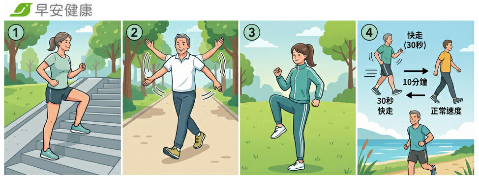 - 變速走:快走30秒,接著以正常速度緩和行走10分鐘,不斷交替重複。透過速度的落差,能像引擎拉轉速一樣,大幅拉高心率與燃脂效率。