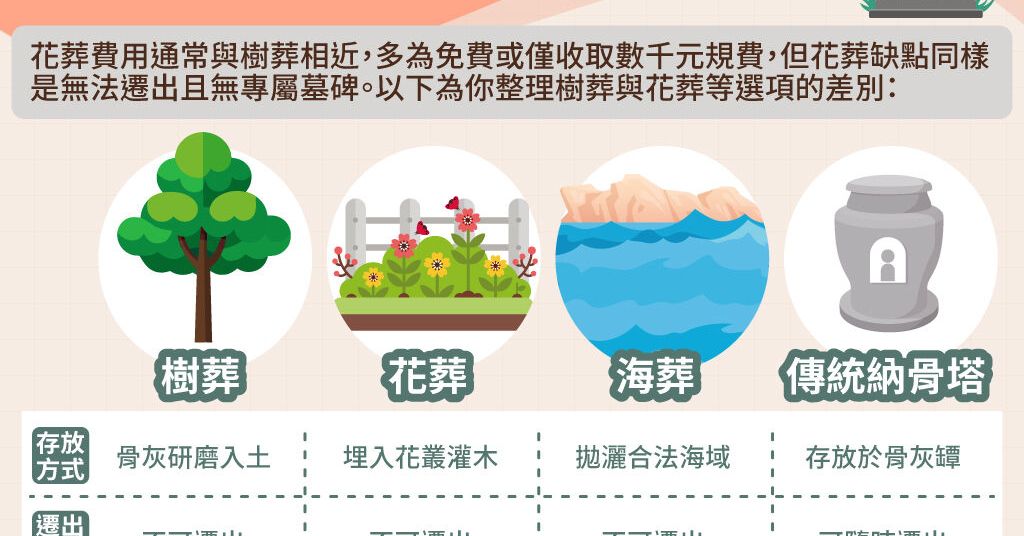 花葬費用通常與樹葬相近,多為免費或僅收取數千元規費,但花葬缺點同樣是無法遷出且無專屬墓碑。以下為你整理樹葬與花葬等選項的差別:
