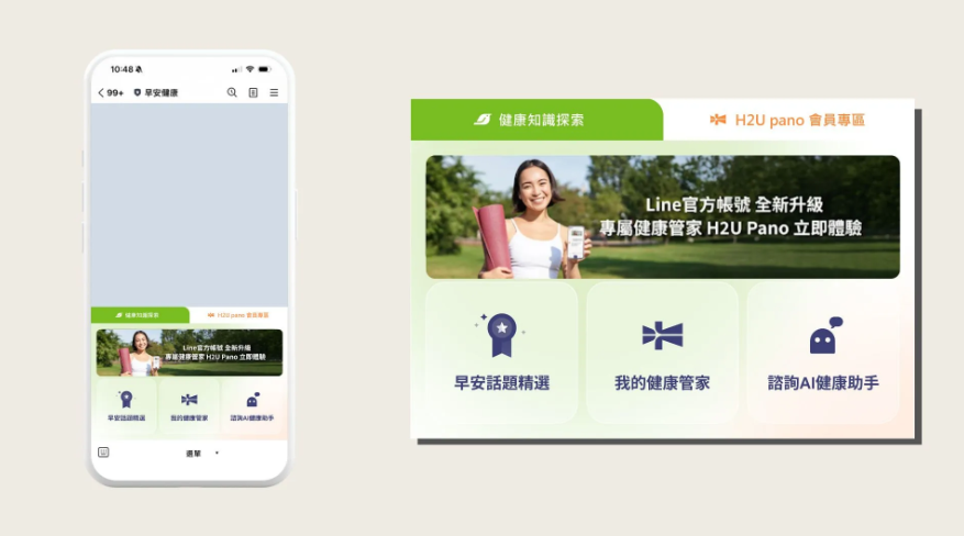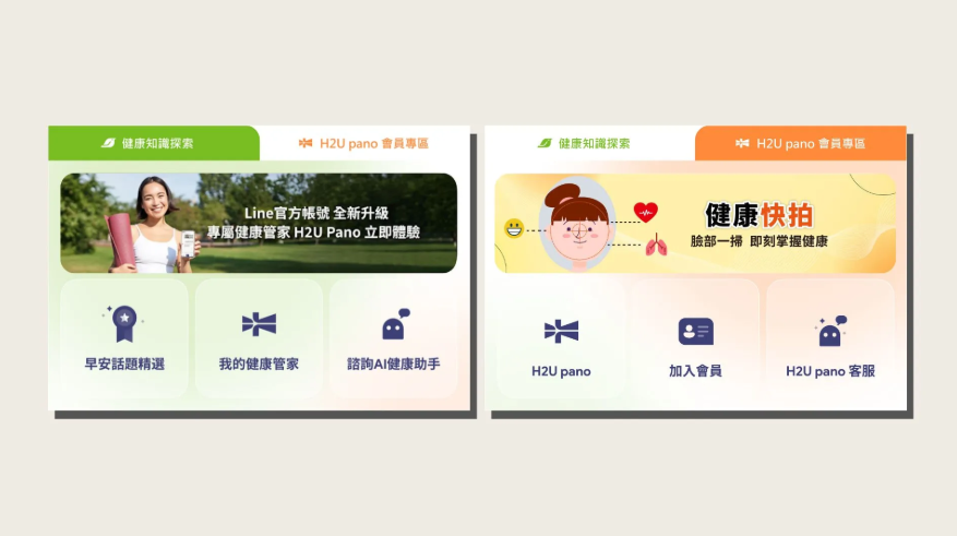 早安健康LINE官方帳號將更名為 「早安健康 | H2U pano 」 ,其中,預設的功能選單綠色分頁,是大家熟悉的早安健康分頁。