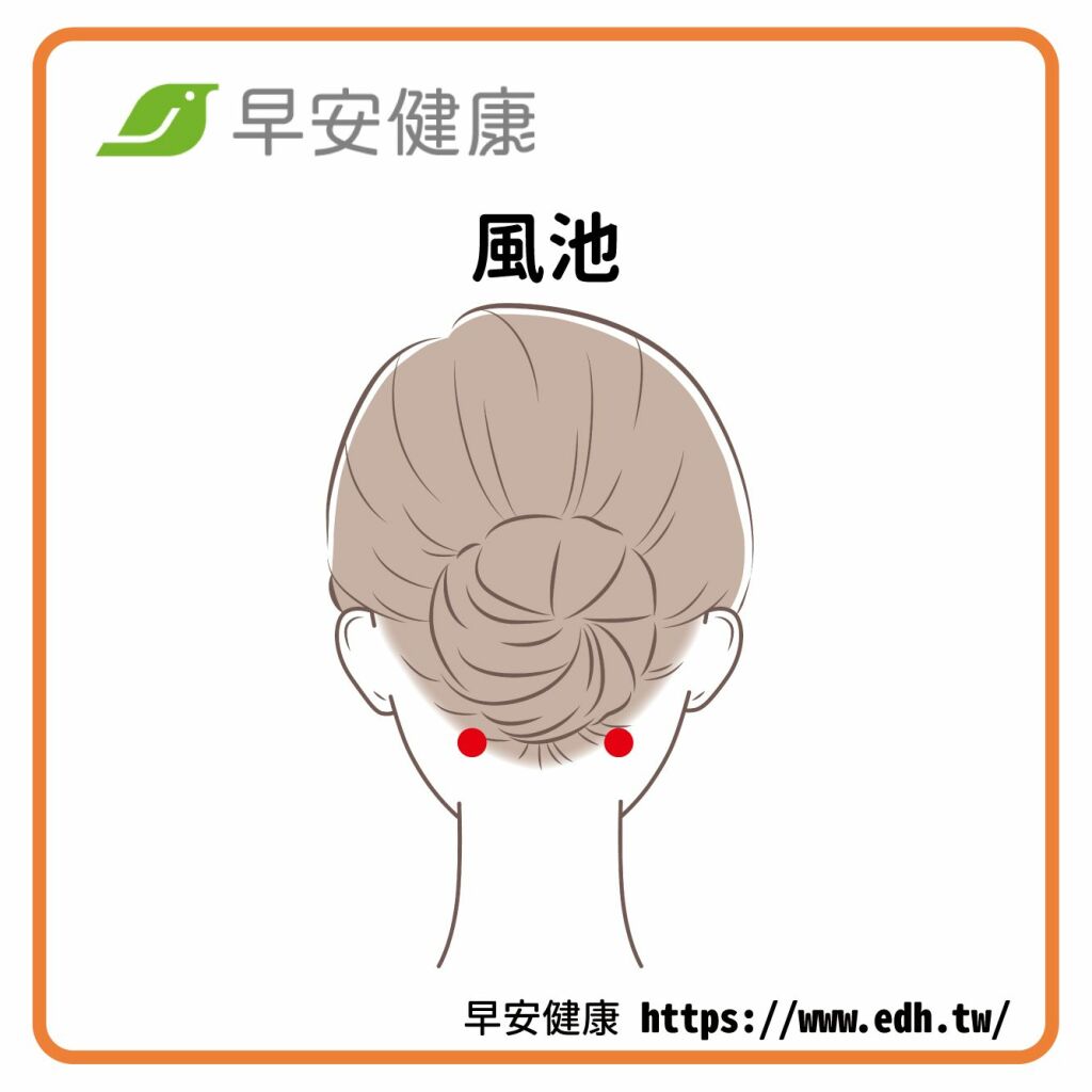風池穴位置在後腦勺枕骨下方兩側凹陷處,通常會在後腦勺髮際線的高度,從中間往左右各約1.5公分寬處。尤其在感冒初期,將手掌放在頭部兩側,用大拇指畫圓按壓風池穴,能感覺到喉嚨疼痛感得到緩解。