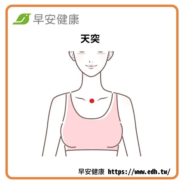 位在兩側鎖骨正中央。從上述按壓方式順著向下循環的方向,最後則會來到位在兩側鎖骨正中央的天突穴,同樣搭配著打哈欠,一邊用拇指畫圈按壓即可。