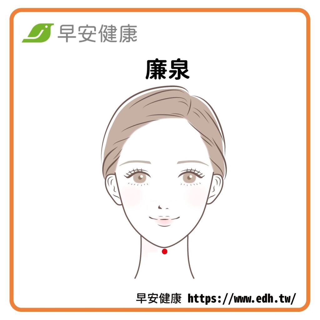 位在下巴跟頸部的交界,它能夠幫助刺激唾液分泌,並且具有抑制喉嚨發炎、祛痰的效果。將食指和中指輕壓在穴道上,並且搭配著打哈欠一邊左右揉動這個位置。