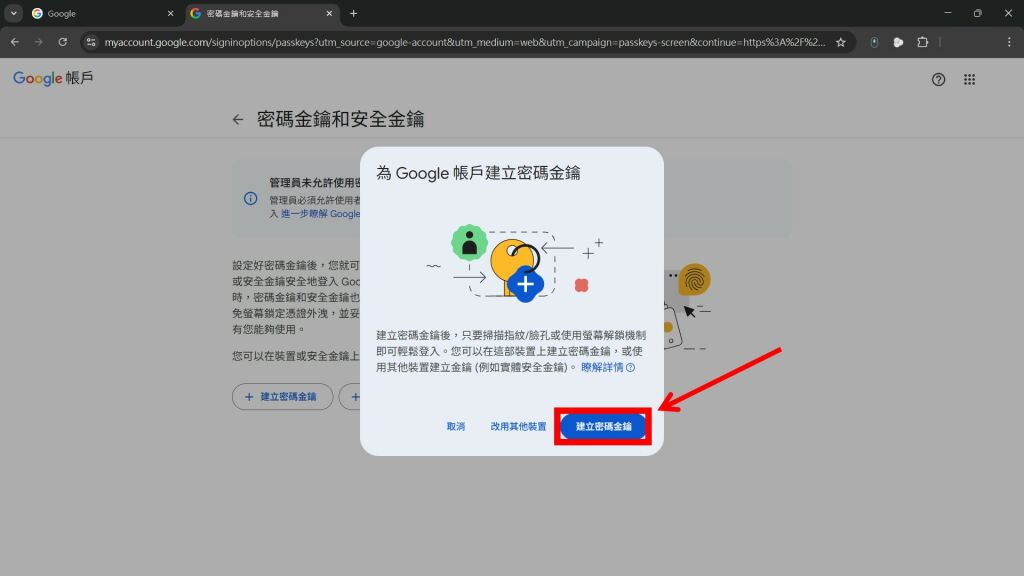 4.接著按下「建立密碼金鑰」,以繼續完成密碼金鑰的設定程序。