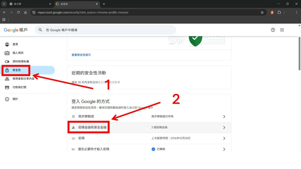 2.進入「安全性」的項目,在「您登入Google的方式」當中點選「密碼金鑰」。