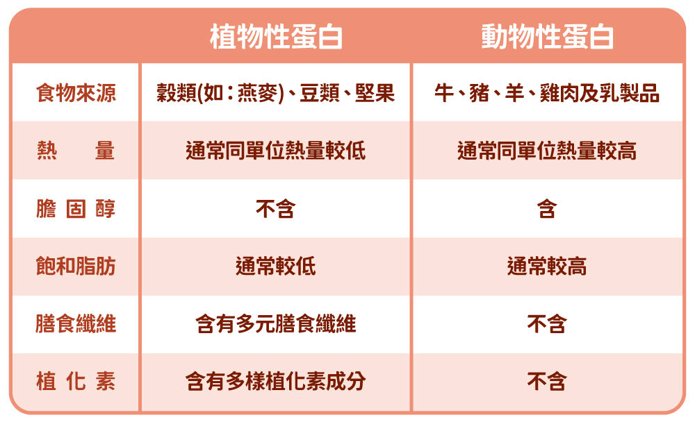 提及優質蛋白質,許多人首先會想到的是雞胸肉、牛奶等動物性蛋白,近幾年隨國人健康意識日益提升,「植物性蛋白」則逐漸受到重視,如穀類(如:燕麥)、豆類、堅果等,相較動物性蛋白,植物性蛋白通常脂肪含量低、不含膽固醇,並且適合對乳糖敏感或素食者攝取、較少負擔,除了能提供多元胺基酸,還含有植化素、膳食纖維等成分,更能全面補充營養。