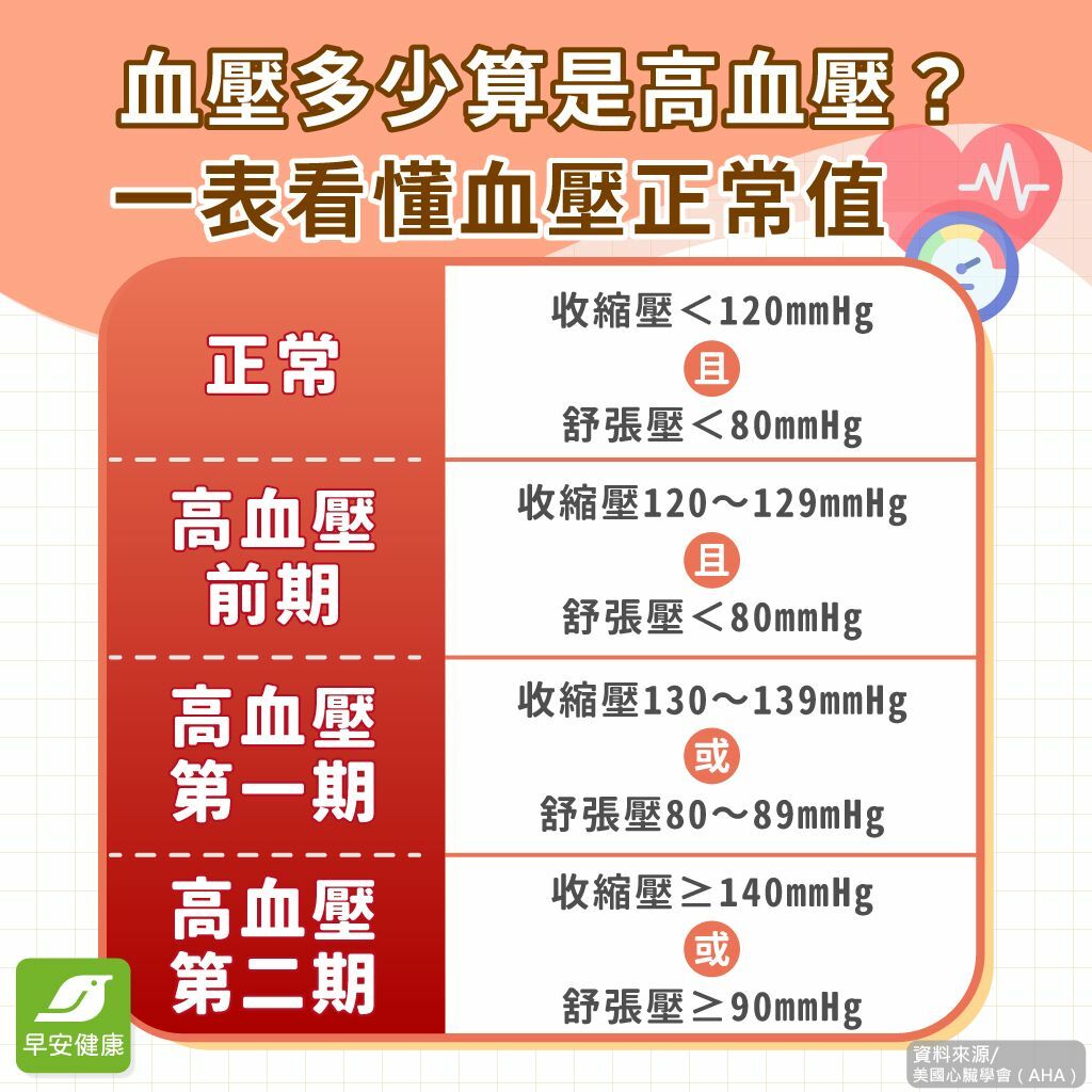 | 高血壓第一期 | 收縮壓130~139mmHg,或舒張壓80~89mmHg | 已屬高血壓,需積極改變生活習慣並諮詢醫師。 |