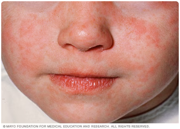 - 出疹期:發燒約3到4天後進入此階段,紅疹會從耳後開始蔓延至臉部,接著向下擴散到全身。