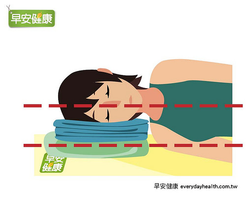 準備一個約3~4公分厚的硬座墊(用久了裡面的棉絮變硬較佳),以及兩條50公分以上的毛巾。在坐墊上折起堆疊毛巾,要讓坐墊和毛巾的邊緣呈現直角。直角要與側躺時的肩膀相符,並且讓通過臉的中心線,能與坐墊保持平行。如此即使睡眠中不施力,也能輕鬆地翻身。