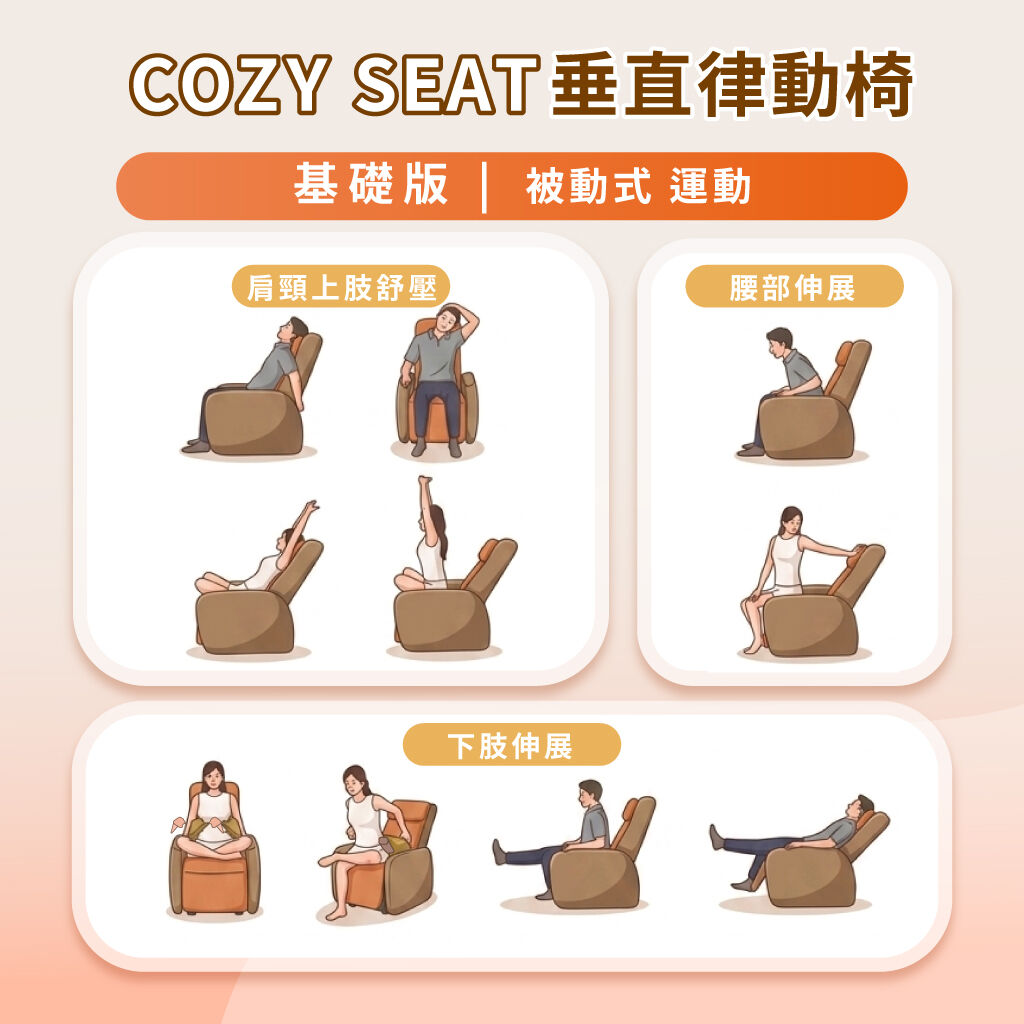 不用逼自己動,「COZY SEAT垂直律動椅」坐著也能活動,輕鬆協助肌群動起來