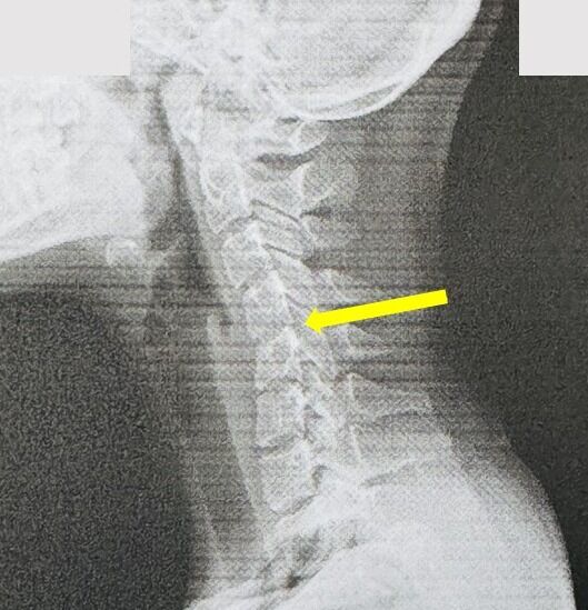 圖片說明:X 光片顯示,該患者的頸椎排列不正常,且椎間盤高度明顯降低,甚至出現輕微骨刺增生