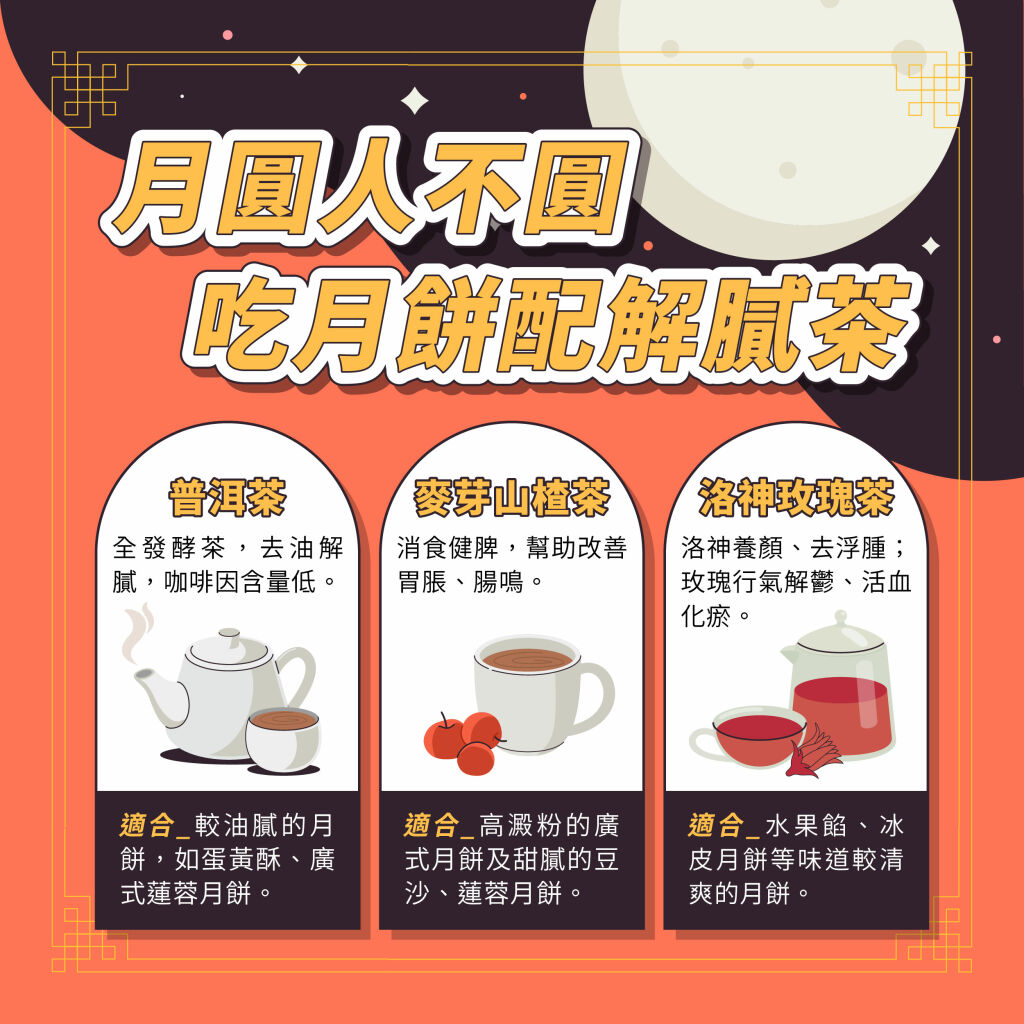 中醫的理論認為,甜膩食物容易傷脾生濕,一旦身體的濕氣太重,容易消化不良、身體疲憊感、甚至水腫,以下三款茶飲可依月餅性質搭配: