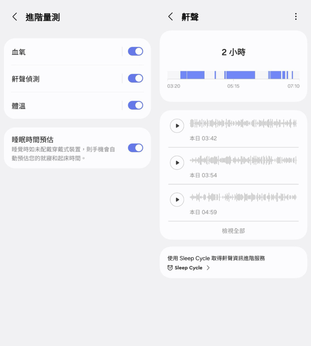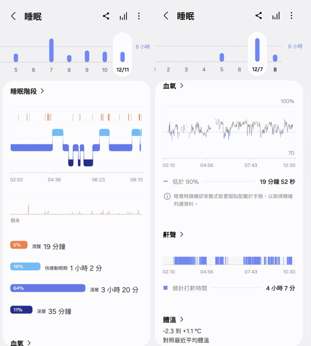 ▲睡眠教練可幫助偵測睡眠品質基礎還包含血氧、鼾聲頻率、體溫…等