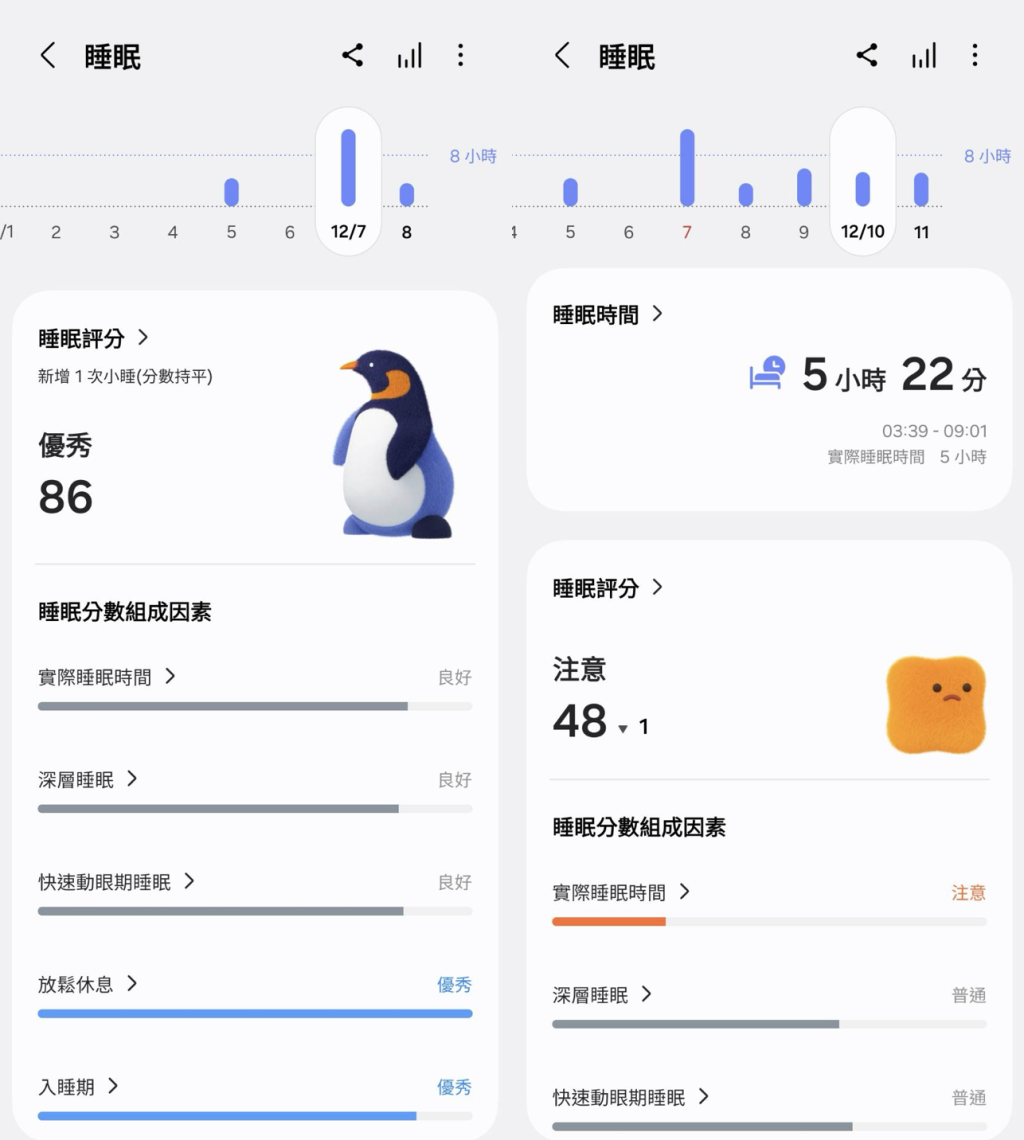 ▲睡眠教練可針對前一晚睡眠組成資訊,提供評分與注意提醒