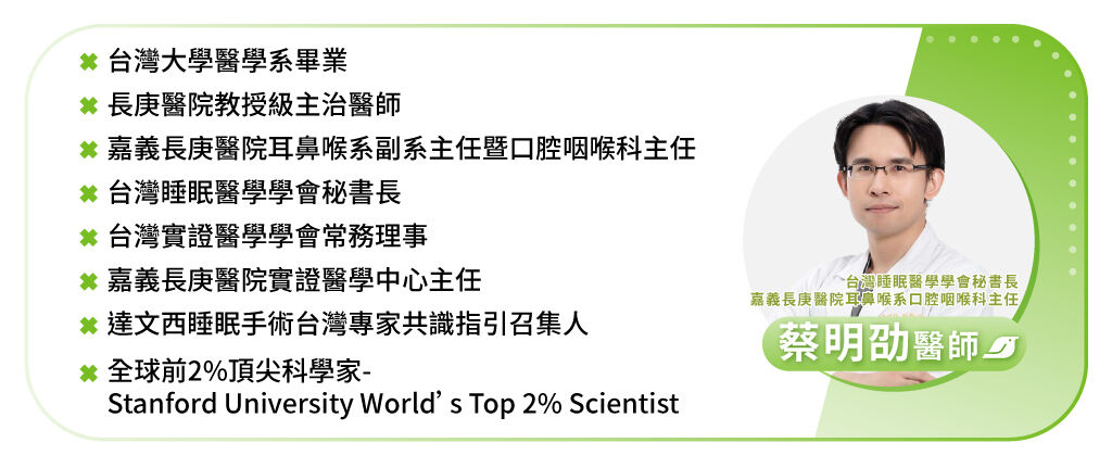蔡明劭醫師也補充提醒以下族群特別留意:中老年人、男性、肥胖、下巴較小、舌頭大、頸圍較粗、扁桃腺肥大、鼻過敏嚴重的人,都屬於睡眠呼吸中止症的高風險族群,若打呼嚴重、愈睡愈累,都應提高警覺,盡早接受檢測與治療。