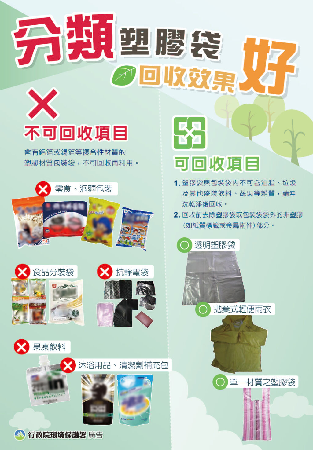 - 不含鋁箔、銀膠或其他背膠貼合的複合材質塑膠袋,才可以回收。