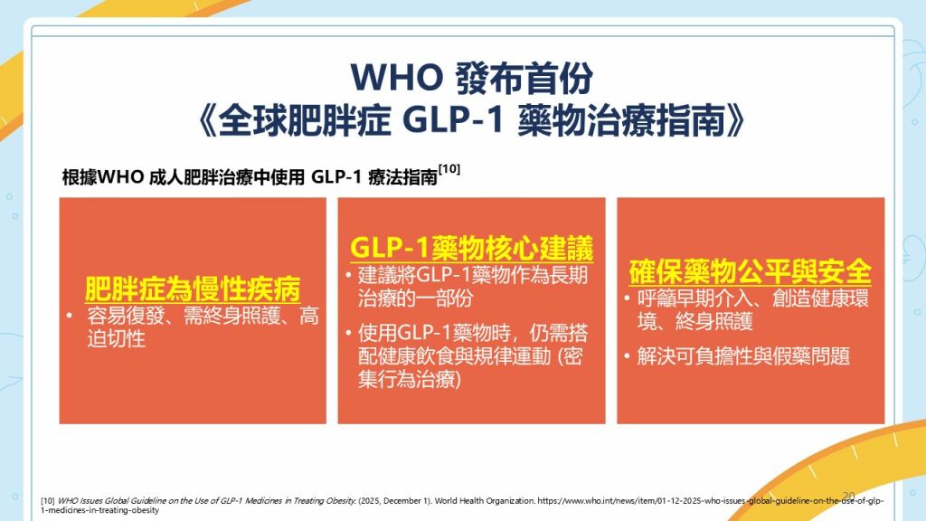 近期WHO 發布首份《全球肥胖症 GLP-1 藥物治療指南》,建議將 GLP-1 藥物作為肥胖的長期治療選項,並應搭配密集行為治療,才能達到較好的管理效果。