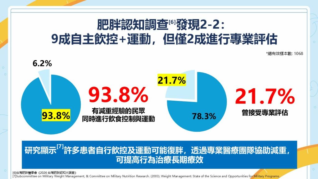 - 專業評估不足:93.8% 以飲食+運動嘗試,但僅 21.7% 接受專業醫療評估;缺乏監測易失敗或反彈。
