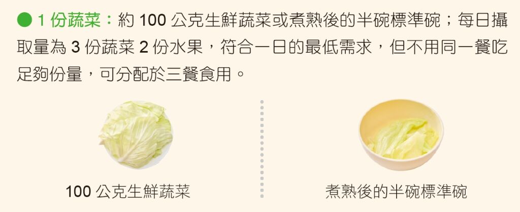一半為蔬菜與水果:蔬果為偏鹼性的食材,並提供膳食纖維、水溶性維他命,協助調整腸道環境,幫助益菌生長,達到植物、降酸、好腸道。1份蔬菜約100公克生鮮蔬菜或煮熟後的半碗標準碗;每日攝取量為3份蔬菜2份水果,符合一日的最低需求,但不用同一餐吃足夠份量,可分配於三餐食用。