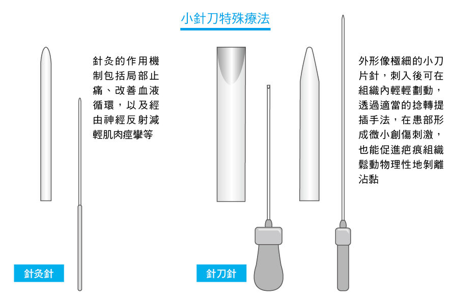 醫師有時會使用一種特殊技術稱為「小針刀」,其外形像極細的小刀片針,刺入後可在組織內輕輕劃動,透過適當的捻轉提插手法,在患部形成微小創傷刺激,也能促進疤痕組織鬆動,物理性地剝離沾黏。