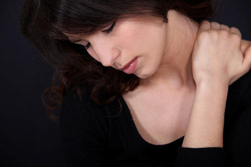 1 找到疼痛點,若是痛點位在右側頸背部,就將右手放在痛點,反之亦然。