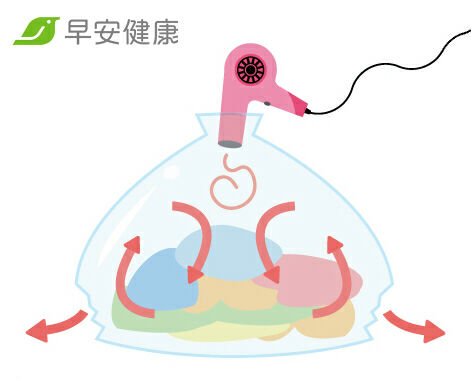 將大型塑膠袋的底部兩個角各剪出一個開口,再把衣服放進去、用吹風機朝袋子裡面吹,同時輕拍袋子底部、讓衣物來回翻動,大約10分鐘就能乾透。