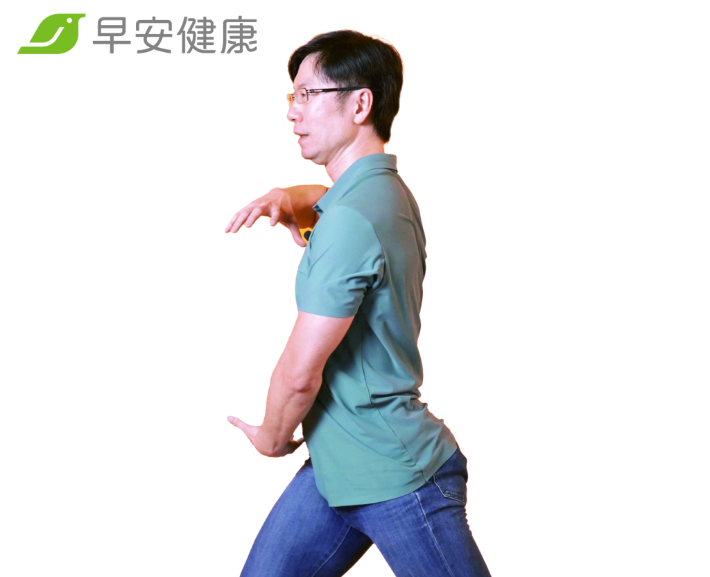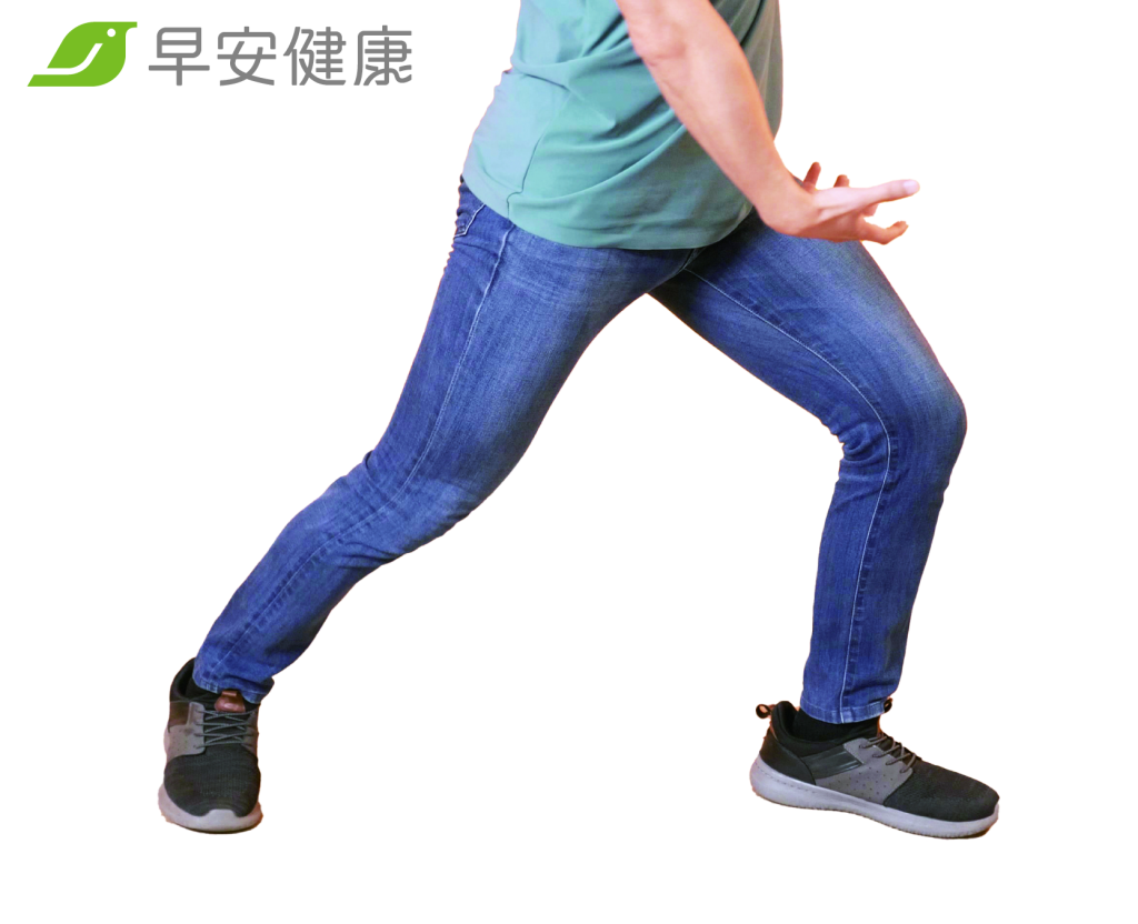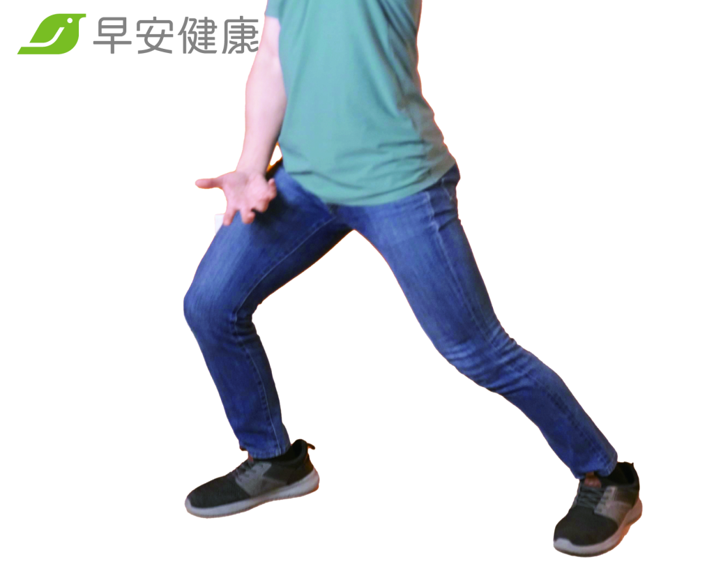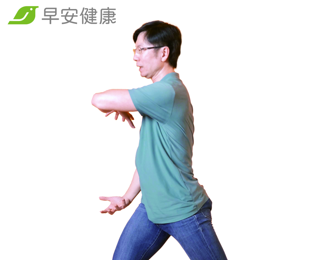5.身體從右側轉向左側,同樣上半身姿勢維持不變,腿部姿勢轉為向左方向的弓箭步。
