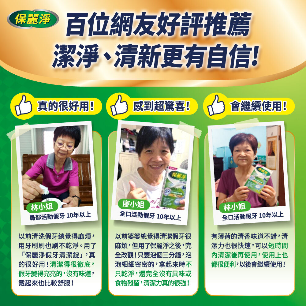 還有位70歲的奶奶開心分享:「早上拿出來,假牙亮晶晶的,一沖水就乾淨溜溜,不用費力刷洗,對於我這年紀、手腳比較不靈活的人真的省時又省力。」以及一位50多歲試用者也很可愛地說:「以前都隨便沖一沖,假牙還是有味道,現在用這個新款的一錠丟下去,泡完亮晶晶、乾乾淨淨!連孫子都說阿嬤笑起來好香喔~😆」