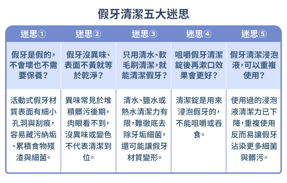 假牙如果清潔沒做好,不只影響外觀,還可能滋生細菌、產生異味,影響口腔健康。但許多人以為假牙只需「泡水或用牙刷刷一刷」就乾淨了, 根據觀察,常有的5大假牙清潔迷思,包括: