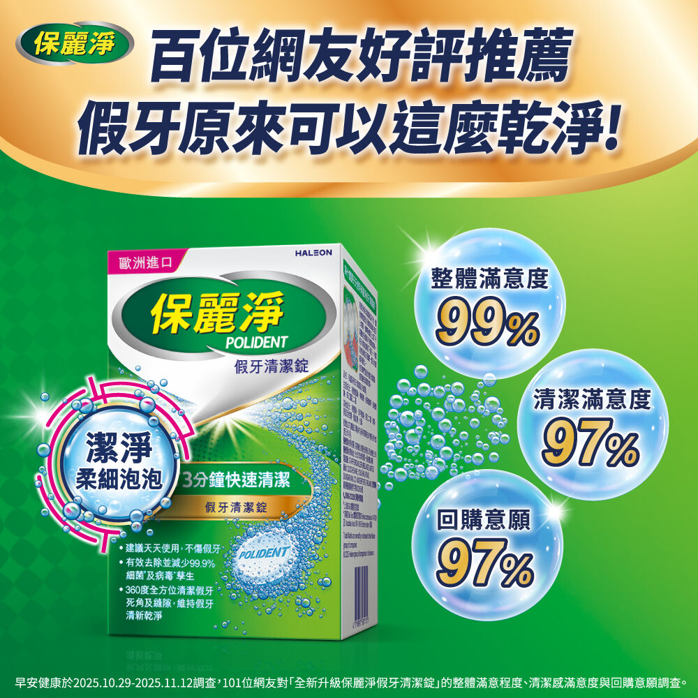 北市衛器廣字第115010188號,衛署醫器輸壹字第 002055 號 保麗淨假牙清潔錠 (未滅菌 ) 、 衛署醫器輸壹字第 006471 號 保麗淨假牙淨白清潔錠 (未滅菌 )、衛部醫器輸壹字第 021748 號 保麗淨假牙清潔錠 局部式活動假牙用 (未滅菌) 、 衛部醫器輸壹字第 021850 號 保麗淨口腔護具清潔錠 (未滅菌 )。英商赫力昂股份有限公司台灣分公司 台北市忠孝西路一段 66 號 24 樓 Trademarks are owned by or licensed to the Haleon group of companies.©[2026]Haleon group of com-panies or its licensor. PM-TW-POLD-26-00001
