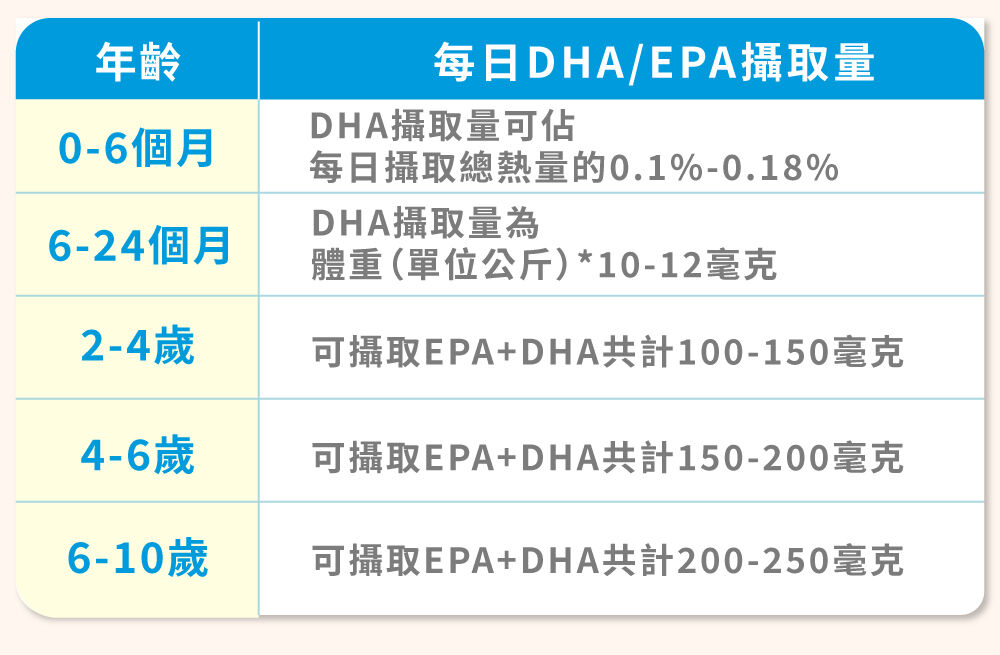 A:目前一般建議,2歲以上兒童可補充魚油,並以DHA為主。聯合國糧食及農業組織(FAO)則是建議,2歲到10歲兒童可每日攝取EPA及DHA共計100-250毫克(參見表格)。若有需要,父母也可諮詢醫師的專業建議,依小朋友的個人體質加以評估。