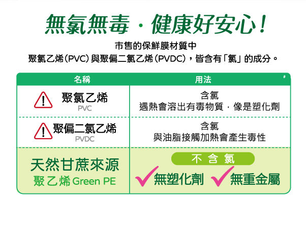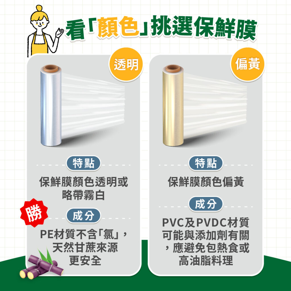 看「成分」: 優先選擇以天然甘蔗等植物原料製成的PE保鮮膜;避開含氯材質如 PVC、PVDC,減少遇熱時材質變化的風險。