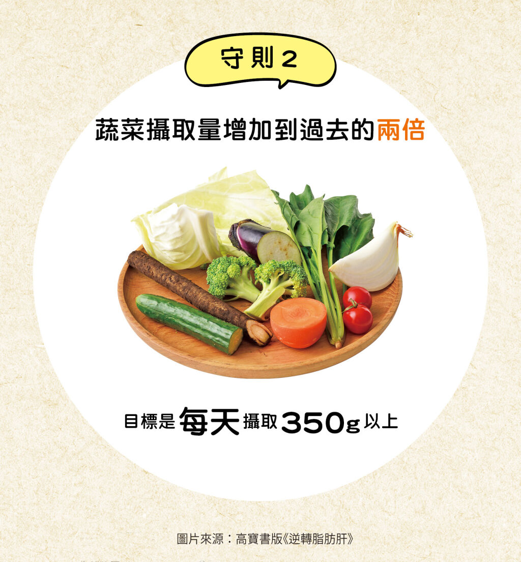 守則2:蔬菜攝取量改成過去的2倍,每天的目標是攝取350g以上的蔬菜