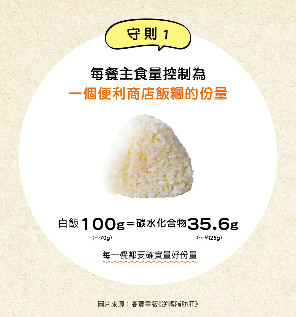守則1:每餐主食量控制為1個便利商店飯糰的份量(白飯100g)