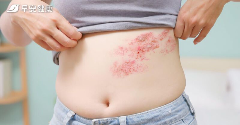 ▲帶狀疱疹最常見的病灶是皮膚會出現一整片帶狀分布的皮疹與水泡,患者可能會感覺到皮膚癢、刺痛等症狀