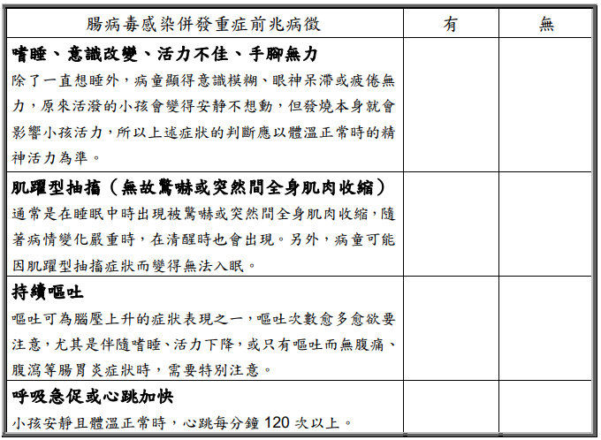 疾管署呼籲,若家中幼童感染腸病毒,家長需要在發病後7天內注意病情變化,如果出現意識不清、手腳無力、持續嘔吐等症狀,就要緊急就醫,也可以利用「腸病毒感染併發重症前兆病徵自我檢查表」做初步確認,降低重症發生的機會: