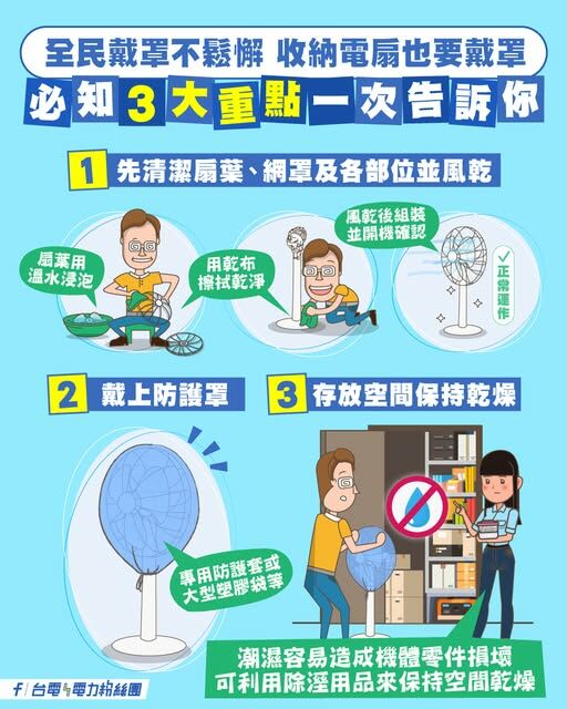 最後,電器一旦潮濕就容易出現機體零件損壞的狀況,所以洗好的電風扇,務必要收納在乾燥的空間,建議在該空間內放除濕盒、除溼片等除溼用品,延長電風扇的使用年限。