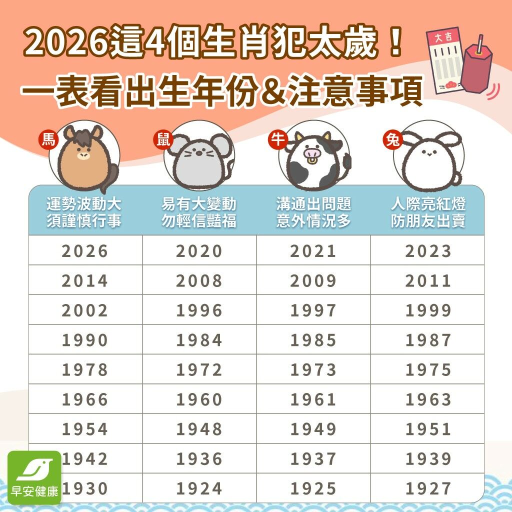 再過不久就是2026年(丙午年)了,許多人開始關注自己明年有沒有「犯太歲」。從傳統習俗來看,犯太歲的生肖在當年可能面臨工作運勢不佳、人際關係受阻,甚至影響身心健康,到底什麼是犯太為?2026年有哪些生肖犯太歲?如何在家自己安太歲?《早安健康》將為你完整解答!