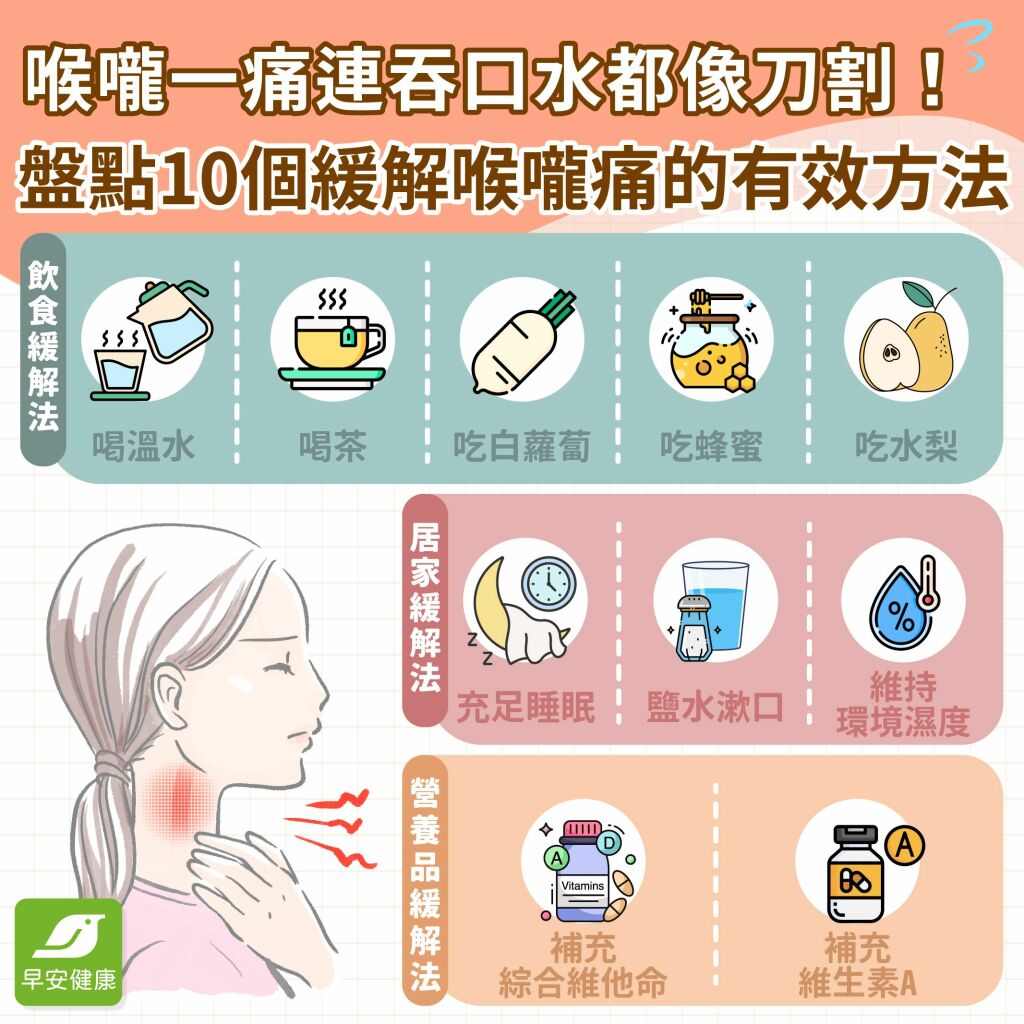 如果想要快速緩解喉嚨痛的不適感,可以吃一些舒緩喉嚨痛、改善喉嚨發炎的食物,並且養成睡飽、維持環境濕度和補充特定營養品的習慣,這樣一來,下次又出現喉嚨痛的症狀,也不至於康復得太慢!