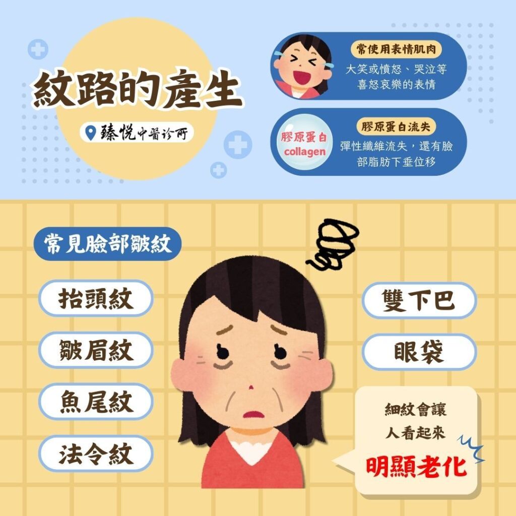 細紋會讓人看起來明顯老化,通常和幾個因素相關:常常使用表情肌肉,包過大笑或憤怒、哭泣等喜怒哀樂的表情,歲月造成的膠原蛋白、彈性纖維流失,還有臉部脂肪下垂位移等等有關。