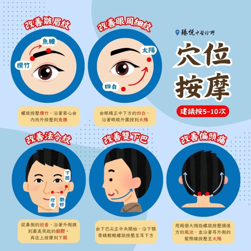 - 改善皺眉紋:螺旋按壓攢竹穴,並且沿著眉心由內而外按壓到魚腰穴。