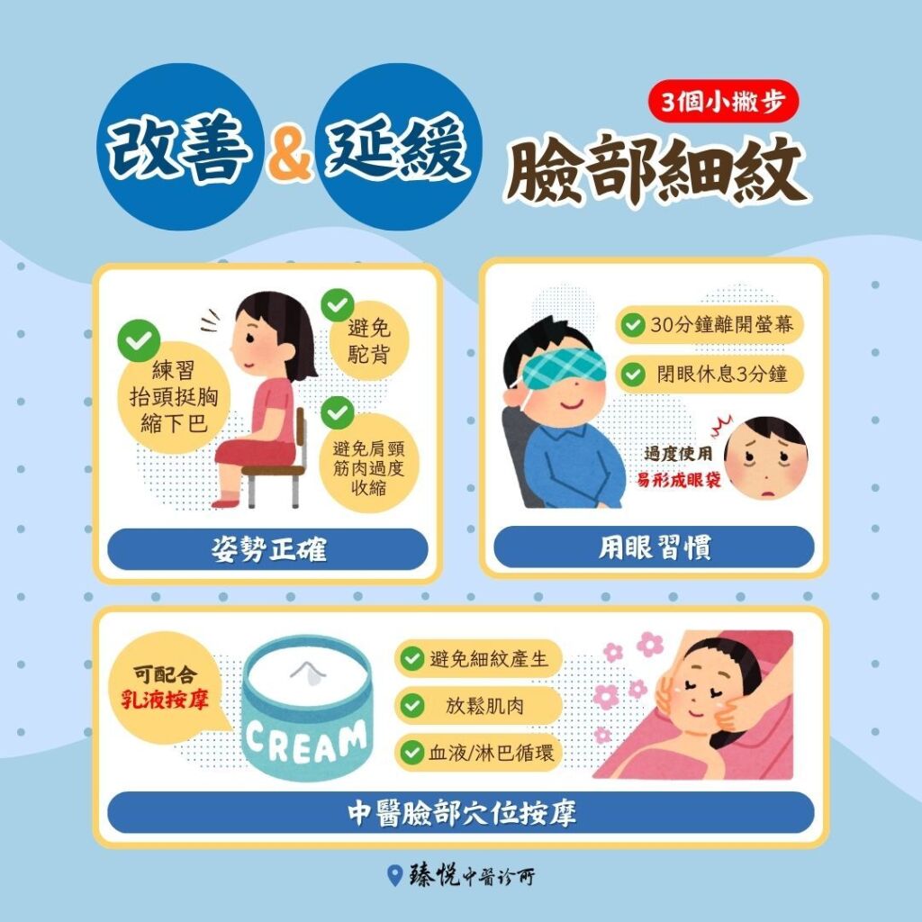 - 姿勢正確: 避免駝背,練習抬頭挺胸縮下巴,避免肩頸筋肉過度收縮。