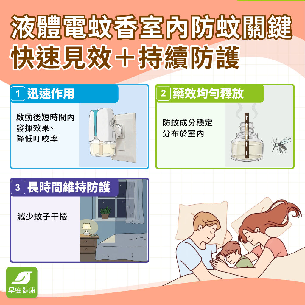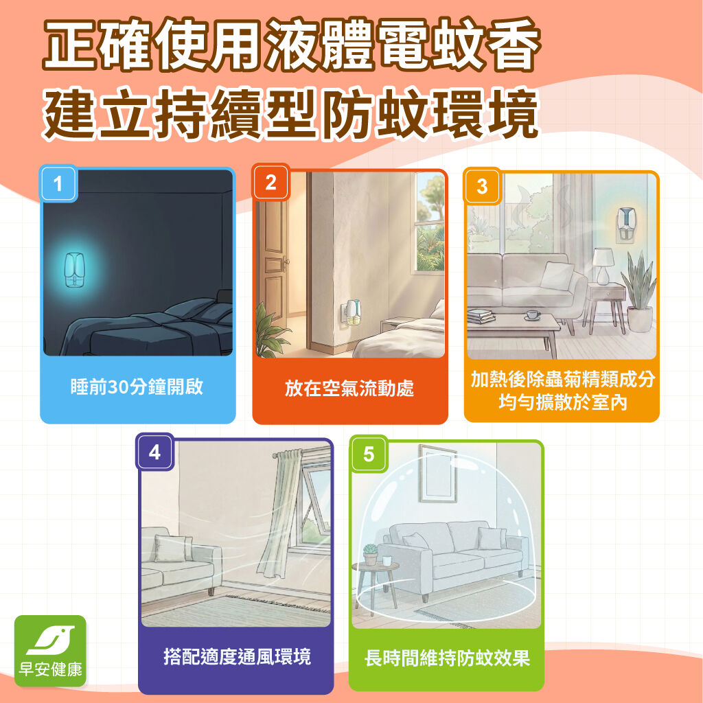 相較之下,建立「持續型防蚊環境」更有效,例如:睡前約30分鐘開啟液體電蚊香、放在空氣流動處,讓防蚊成分能均勻擴散於室內,搭配環境整理與適度通風,能長時間維持防蚊效果,減少蚊子干擾。