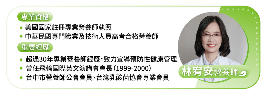 林宥安營養師畢業於美國雪城大學,專攻營養與食品管理。在陳宇助董事長的鼓勵下,她創立了【花甲騏蹟營養專家】,致力於推廣正確營養觀念,協助家庭與熟齡族群「吃對、吃好」,維持健康與活力。