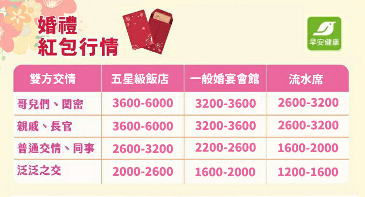 - 避開單數:喜事成雙,除了 9(象徵長長久久)之外,應避開 1、3、5、7 開頭的單數金額(如 1,100、3,000、5,000),因為單數通常用於喪禮,建議多加600到1,000,像是1,600、3,600或6,000,都是不錯的數字。