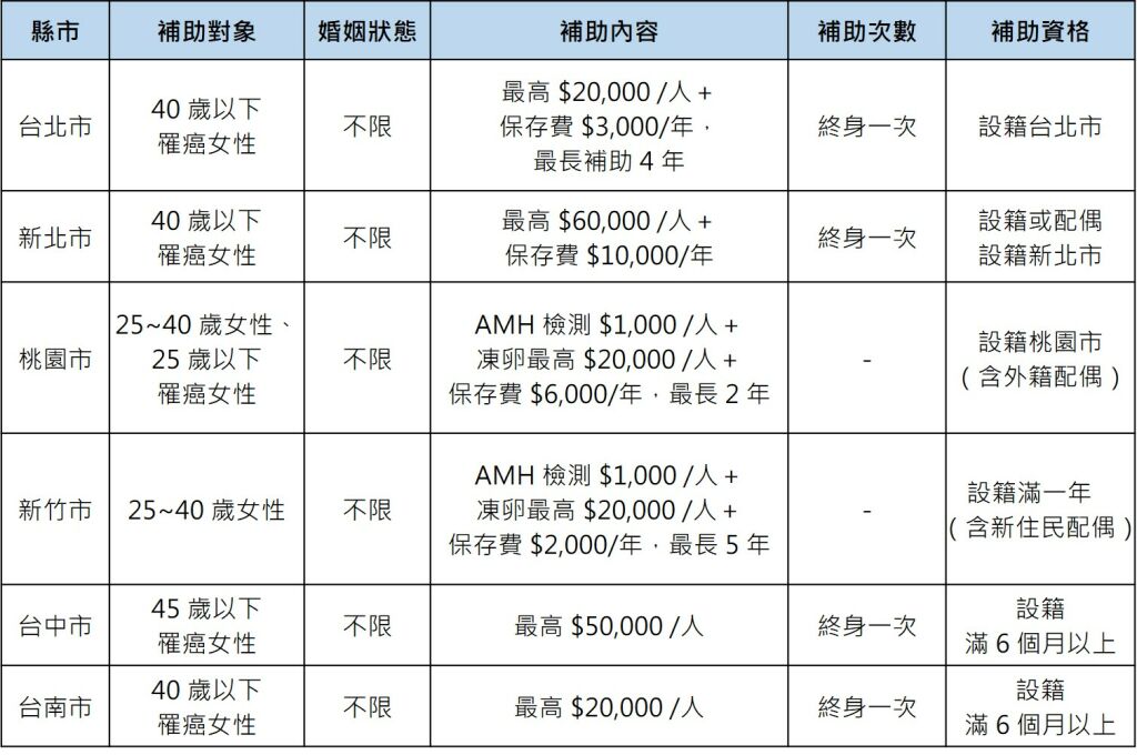 為了鼓勵女性保留生育選擇,近年許多地方政府陸續推出凍卵補助方案,下列統整 2025 年六都凍卵補助適用對象與補助內容: